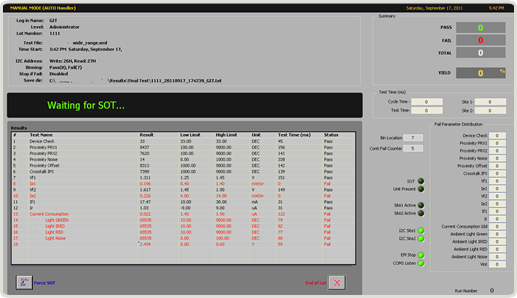 This tester was designed for the customer for testing a fully integrated proximity sensor and ambient light detection device in a single package. Test parameters include typical IR emitter electrical test parameters, ASIC function test, I2C communication test and light detection testing. The tester system is a dual site system in a pipelined operation for a faster test time.