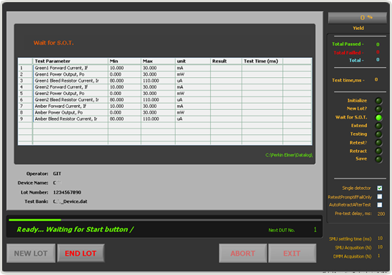 The actual GUI is as shown on the figure below. It displays relevant information needed by the test engineer supervising the testing.